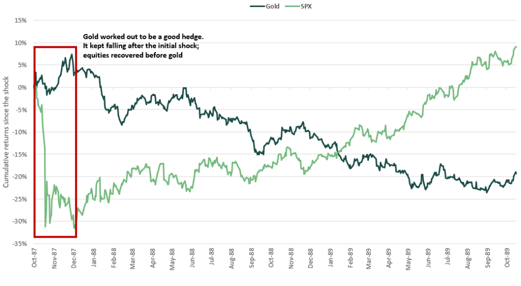 In this case, during the initial phase gold rallied as equities fell, and when equities started recovering, gold fell again. Gold worked as a hedge around the Black Monday crisis.