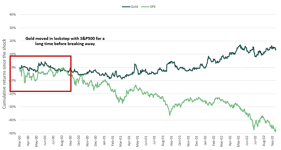 During the dot-com bubble burst, though gold behaved as a hedge at the beginning, it also had periods of extremely high correlation with equities.