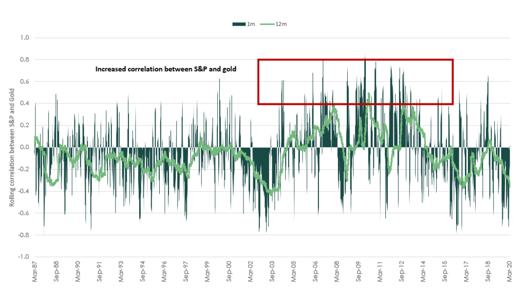 Gold performed differently in the three crises. Gold’s correlation with S&P saw sharp spikes during crisis periods, however, over the longer term, there are no doubts regarding gold’s position as a diversifier. Over the past 30 years, the correlation1 between gold and S&P500 averages -0.05.