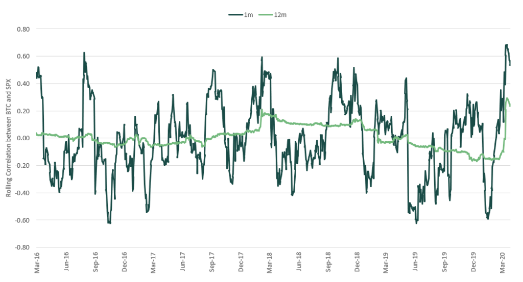 Bitcoin was born after the global financial crisis (GFC) and is now experiencing its first global crisis. When the crisis hit, we observed a typical flight to liquidity as investors sold everything they could. Crypto-investors seem to have acted accordingly. This article shows that the sell-off was driven by short-term holders, which could mean that it was driven by leveraged retail investors or institutions. As we can see in figure 5, the 1 month and 12 month rolling correlations between bitcoin and SPX shot above 0.65 and 0.25 respectively, the first time in both cases.