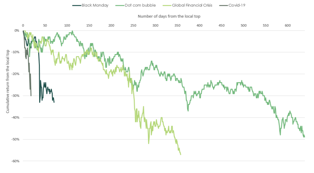 We think that one of the major reasons for the correlation spike is the rate at which markets fell. To put this in context, we looked at historical crises. As shown in figure 6, the rate at which markets have fallen during the current crisis is unprecedented. S&P registered the top on 19 February and it fell by 30% in 19 working days versus 40 days for Black Monday, and almost a year for the GFC. The rapid fall illustrates how surprised markets were and the reading of this chart underscores the sense of panic that lead investors to sell what they could, resulting in high correlations among asset classes.