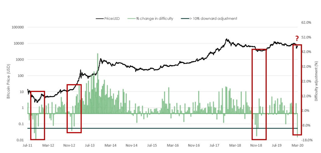 Figure 8: Bitcoin bottoms (difficulty adjustment vs price)