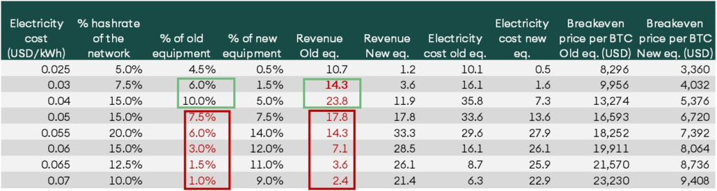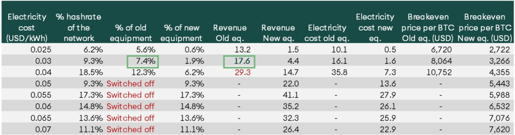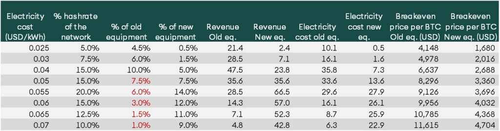 New-generation equipment has the advantage of being less sensitive to electricity prices. In the post-halving scenario, miners in regions with relatively costlier electricity can continue mining even if the price per BTC falls to USD 4000. In the regions with costlier electricity, the new equipment reduces the breakeven point by 60%. Given the rise of new equipment, miners in expensive regions are poised to compete with old mining equipment in low electricity regions.