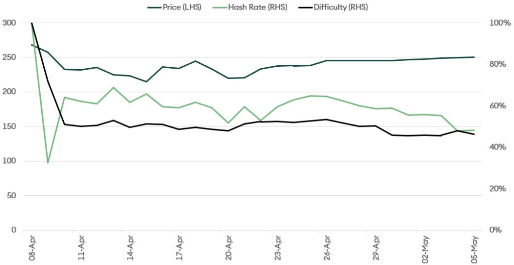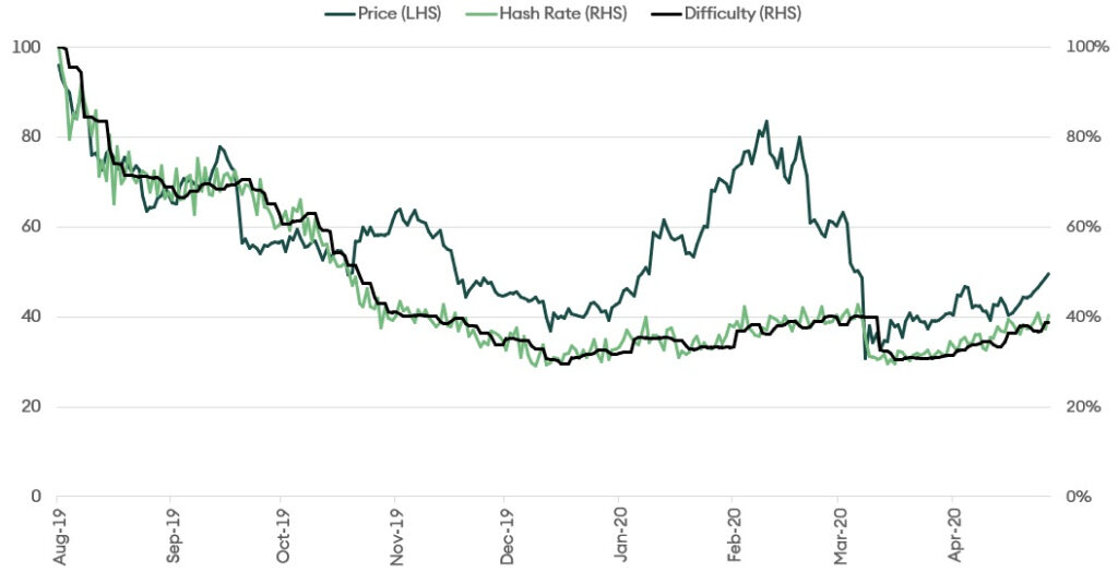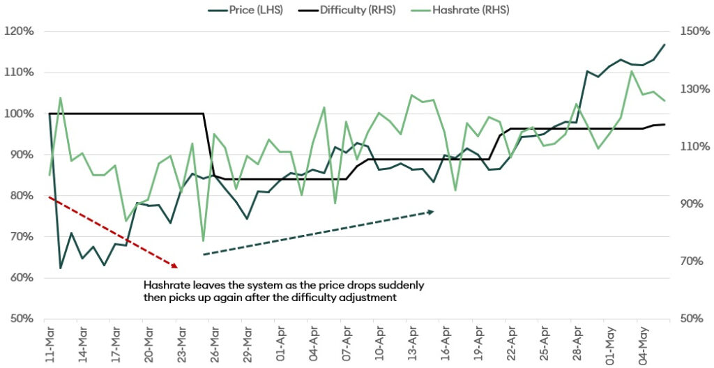 We can estimate how the hashrate may behave after the halving by observing its movement around the March crash. It lends us empirical evidence to understand how the forthcoming halving may play out. As the price suddenly dropped by about 50%, miners’ revenue was halved, and the hashrate dropped. The difficulty adjustment kicked in, and the hashrate began to improve again (see Figure 13).