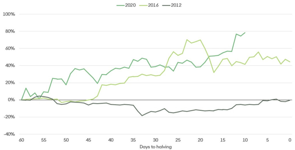 1Bitcoin’s first two halvings took place on 28 Nov 2012 and 9 July 2016, respectively. ↵