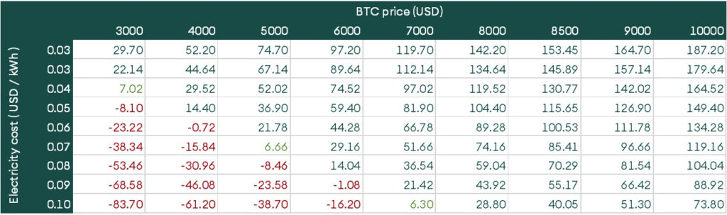 Mining equipment upgrade is crucial because it compensates for falling revenue with increased efficiency. We conducted a sensitivity analysis2 on how the old and new generation3 mining equipment fare based on electricity costs and Bitcoin price. The following charts show the expected monthly profit earned by one mining equipment in US dollars (USD). Losses are in shown in red; marginal profit, light green; and higher profit, dark green.