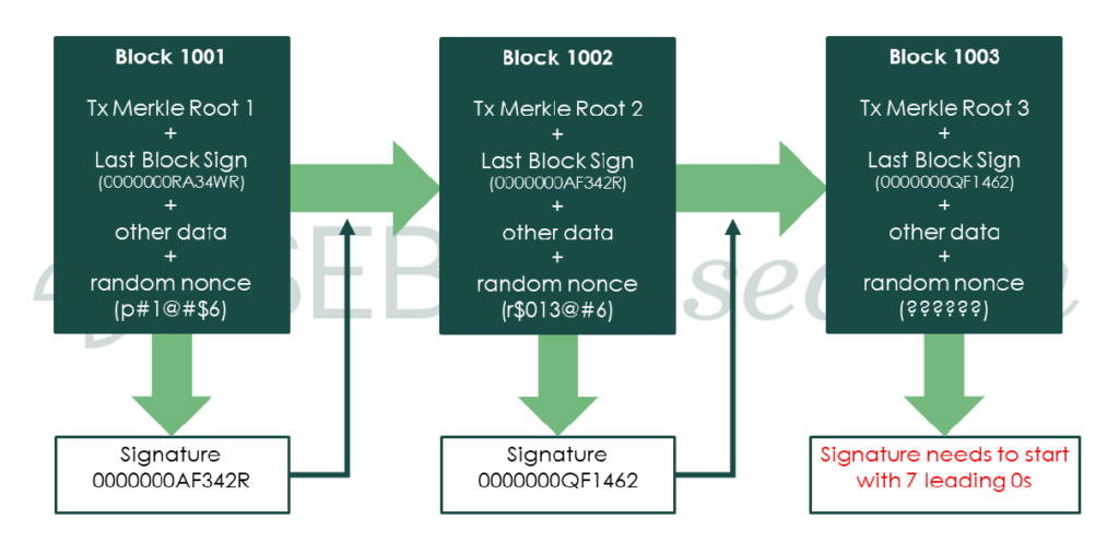 - This is where the process of generating a signature begins (exhibit 2). The signature is created by guessing a nonce7 through trial and error8 in order to generate a required signature for their transaction block. In other words, to obtain the required signature, miners need to keep hashing the block header with different nonces (at a hash rate speed of billions per second) until one of the miners produces a valid signature, i.e., a signature with a specific number of zeros at the beginning (the number of zeros sets the difficulty).