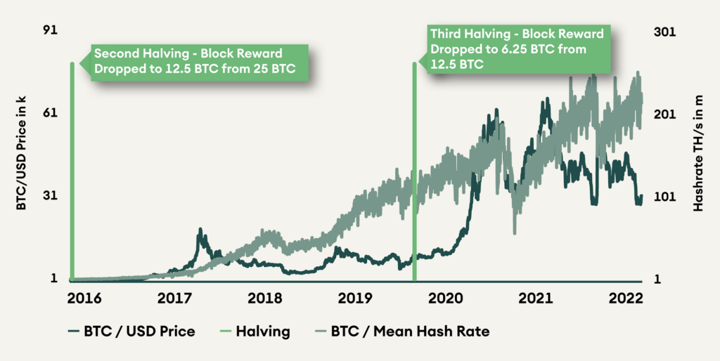 Figure 1: Bitcoin Price & Hashrate with Halving (Data as of 31 May 2022)