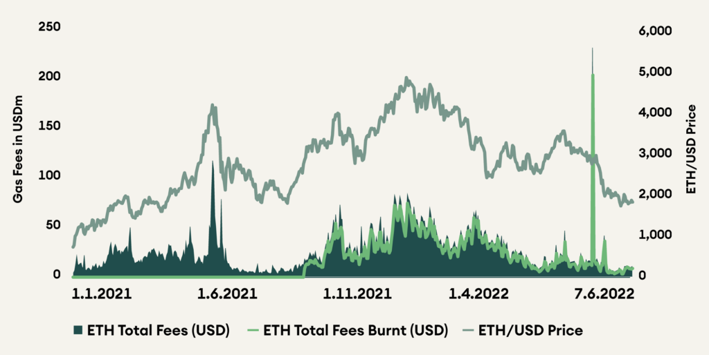 Figure 3: Ethereum transaction total fees with fees burnt post-implementation of EIP 1559 and USD price (Data as of 7 June 2022)