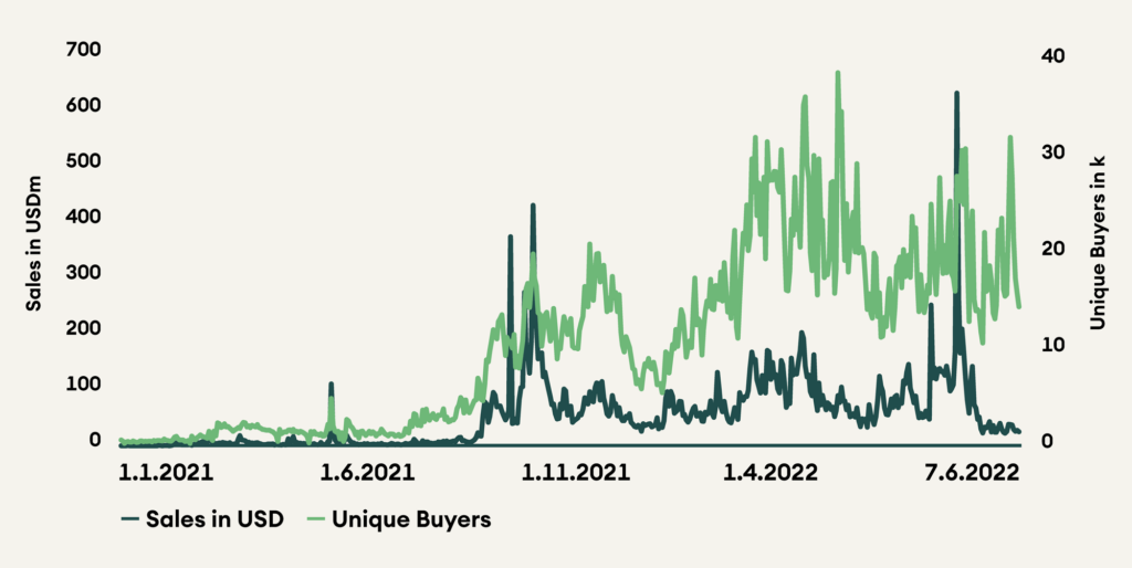 Figure 4: Daily NFT sales volume, with number of unique buyers on Ethereum (Data as of 7 June 2022)