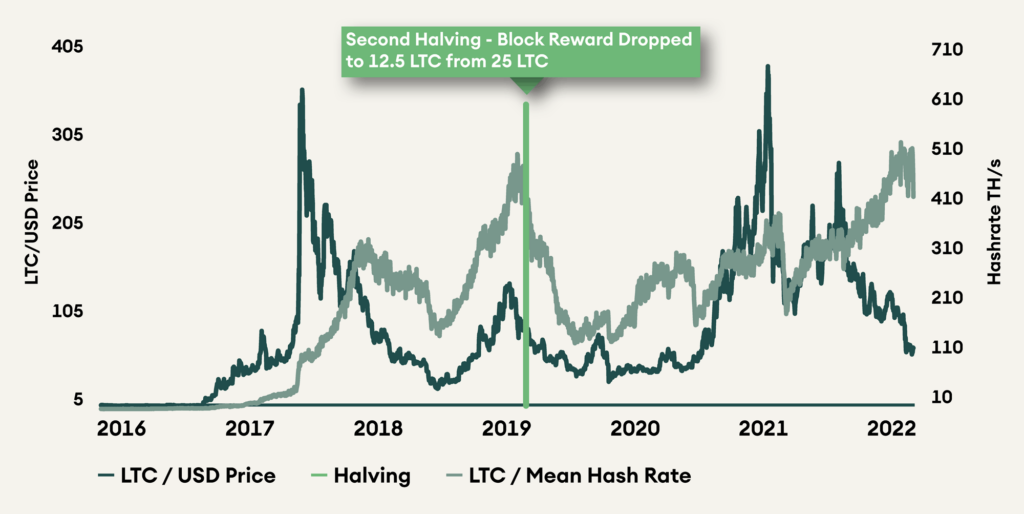 Figure 5: Litecoin Price & Hashrate with Halving (Data as of 31 May 2022)