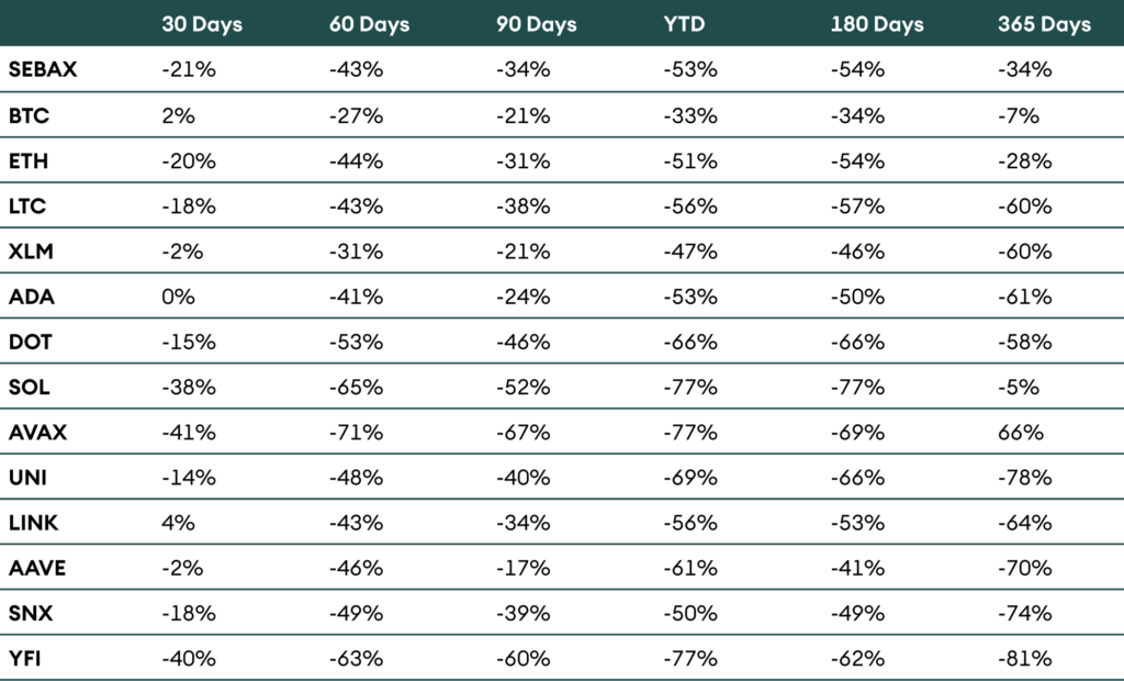 We continue to navigate the market cautiously, preferring low beta cryptos such as BTC and ETH over alternative platforms and DeFi. However, as the sentiment is very negative and prices have corrected significantly, we have reduced our cash position.