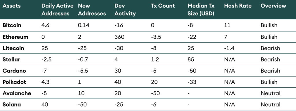 Table 2: On-Chain Activity Overview – 30-day percentage change for all parameters (as of 26 May 2022)