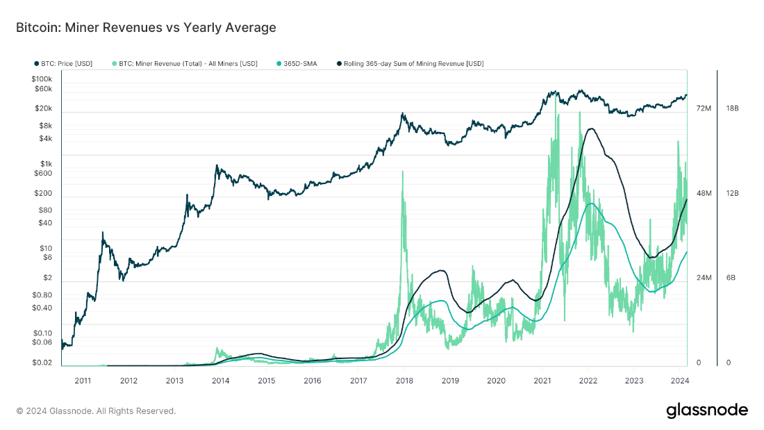 The increased network usage presents a golden opportunity for Bitcoin miners. The intensive computational processes conducted by mining hardware serve a dual purpose: generating new bitcoin and verifying blockchain transactions to ensure the smooth operation of the digital economy. With network activity at near-record highs, the priority for miners has shifted towards processing transactions, relegating the creation of new bitcoins to a secondary role. By February 2024, these dynamics have led to unprecedented mining difficulty levels, yet the mining sector is experiencing substantial profits.