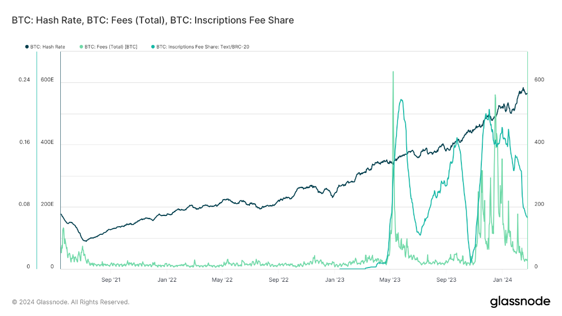 Figure 4: Bitcoin Hash Rate, Fees and Inscriptions Share