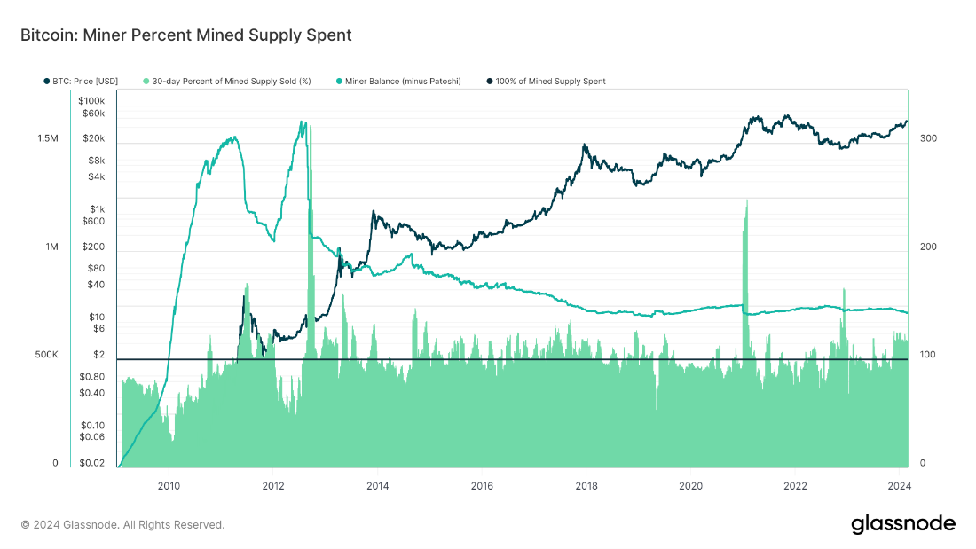 Due to their operational costs, Bitcoin miners are compelled to sell a portion of their mined Bitcoin. This behaviour is quantified by examining the percentage of the mined supply sold by miners within a 30-day period. The competitive and capital-intensive nature necessitates miners selling most of their output to cover expenses.