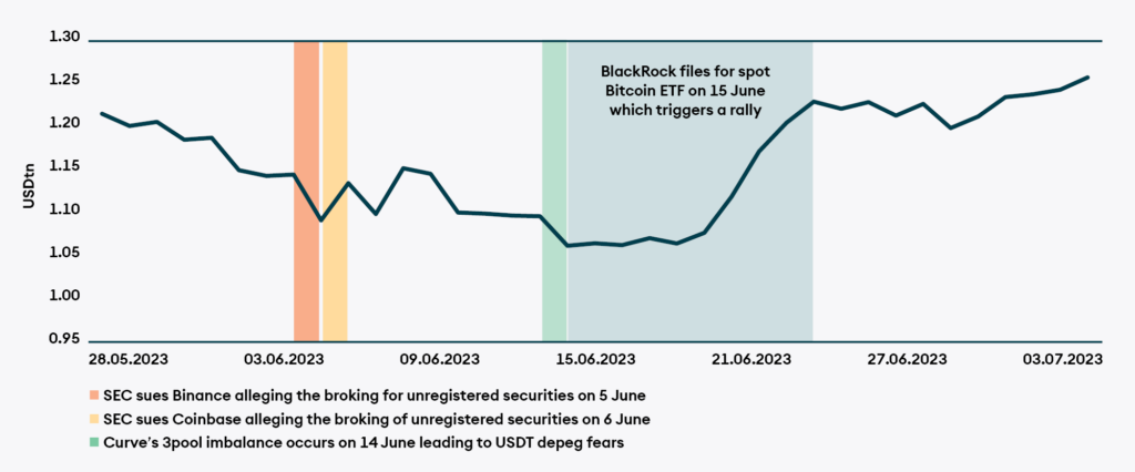Thirdly, an imbalance in Curve Finance’s 3pool led to fears of USDT de-pegging. Curve Finance is a decentralised cryptocurrency exchange (DEX), and the 3pool is a stablecoin liquidity pool on this DEX comprising Circle’s USDC, Maker’s DAI, and Tether’s USDT. Under normal market conditions, the pool holds roughly 33% of each of these stablecoins to ensure balance. At times, there is a significant rise in the weightage of a particular stablecoin in this pool which is a sign of heavy asset selling. On 15 June, USDT weightage in this pool rose above 70%. This pool imbalance led to depeg concerns for USDT, which indicated market participants getting rid of their USDT holdings. Increased exchange volumes and panic prevailed in the market during that time.
