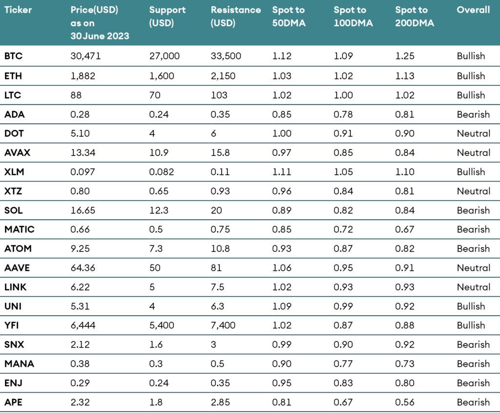The global cryptocurrency market capitalization has reached USD 1.26 trillion, representing a 5.2% growth from the previous month. Bitcoin maintains a market cap dominance of 51.2%, exhibiting month-on-month increases and outperforming altcoins. While spot trade volumes declined notably in Q2 2023, hitting their lowest point since 2020spot trade volumes declined notably in Q2 2023, hitting their lowest point since 2020link1, the primary focus in June revolved around regulatory matters. Despite ongoing concerns, we will delve into the developments within the global digital asset space and offer our constructive viewpoint on the crypto market.