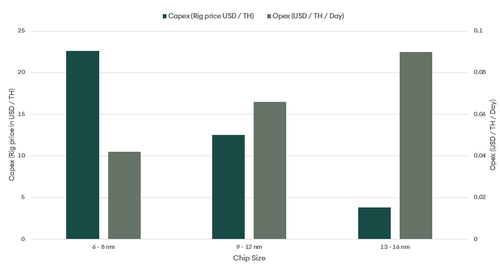 BTC is often the only source of miners’ income. As operational expenditure (Opex) is in fiat currencies, miners are heavily reliant on BTC price to continue supporting the bitcoin network. Gradually, mining equipment manufacturers and miners have optimised equipment and operations to reduce price sensitivity. As a result, capital expenditures (Capex) have increased and operational expenditures have decreased as shown figure 1.