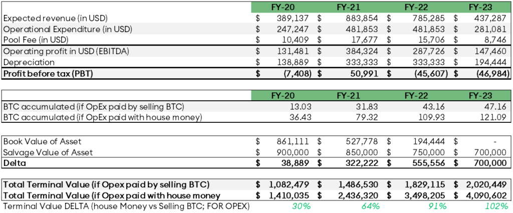 - No machine upgrades for the duration and no new capital expenditures. Therefore, as the total hashrate increases, the mining business’s share in the total hashrate decreases; thus, revenues fall over time.
