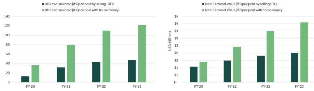 Opex can be covered either by selling earned BTC or through existing cash. Both strategies are prevalent among miners. However, if the assumption is that BTC price will have an ascending trajectory, using existing cash to pay for running costs make more sense.Figures 5 and 6 compare cash flow and terminal value changes resulting from different opex strategies.