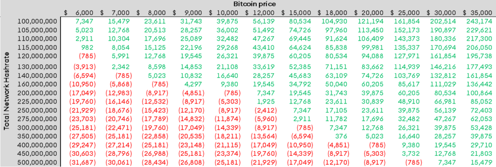 Figure 7: Monthly operating profit sensitivity analysis based on bitcoin price and total network hashrate