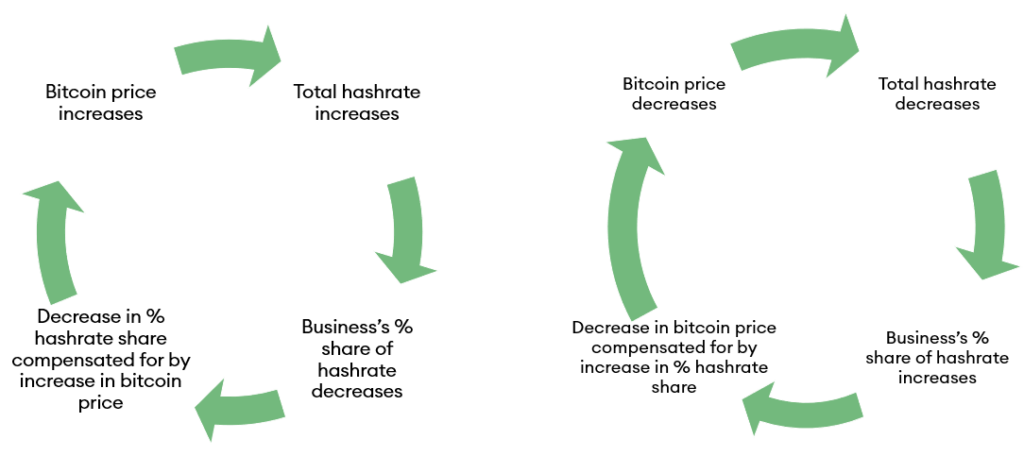 The share in total network hashrate determines the profitability of a mining business. Thus far in the example, we have assumed that the hashrate of the business remains constant. Two possibilities emerge: the total hashrate increases or the total hashrate decreases. What happens in each case?