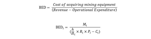 where H = total hashrate, h = miner’s hashrate, R = BTC reward, P = BTC price, M = Capex, and C = Opex. The subscript i denotes time at which new-era mining equipment was launched.