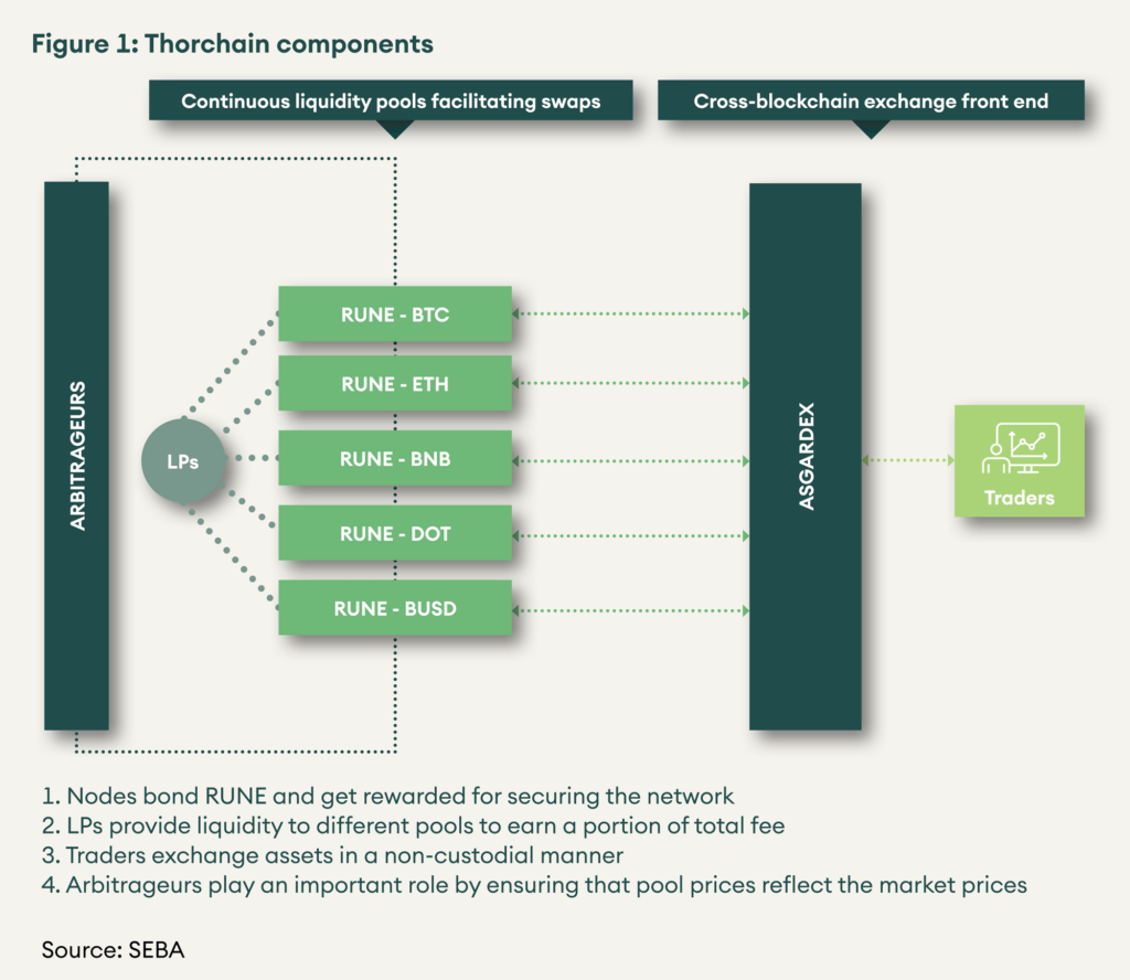 THORchain is a cross-chain non-custodial liquidity protocol. One can imagine THORchain as the Uniswap equivalent for different blockchains. Currently, asset swaps are facilitated by BEPSwap (current web client limited to Binance chain assets) which will be replaced by ASGARDEX (a desktop client that manages the full life cycle of a transaction related to THORchain).