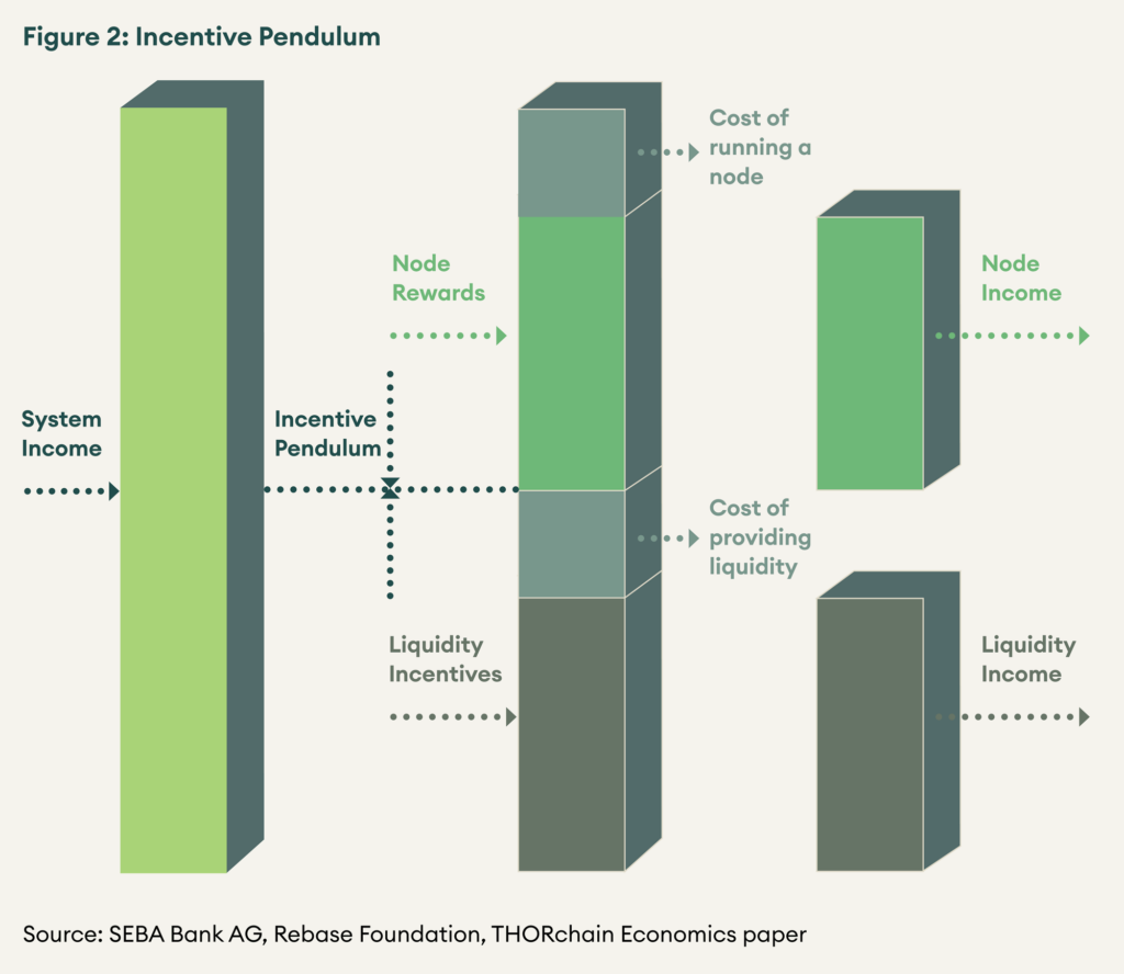 RUNE is used to incentivise Node operators and LPs. Node operators and LPs get two types of rewards, protocol emissions and fee generated from the exchange activity. As mentioned earlier, nodes need to stake at least twice the amount of RUNE staked by the LPs. Therefore, two-thirds of the block emission rewards go to node operators and the remaining one-third to LPs. Fee earned from trades is divided between LPs and node operators using an incentive pendulum mechanism. When bonded RUNE is too high, the system is inefficient; which means LPs need more incentive to pool RUNE. This incentive pendulum shifts towards LPs. When there is too much RUNE in the pools, the system tends to be insecure; which means node operators need to be rewarded more to stake more RUNE. In such a case, the node operators are further rewarded.