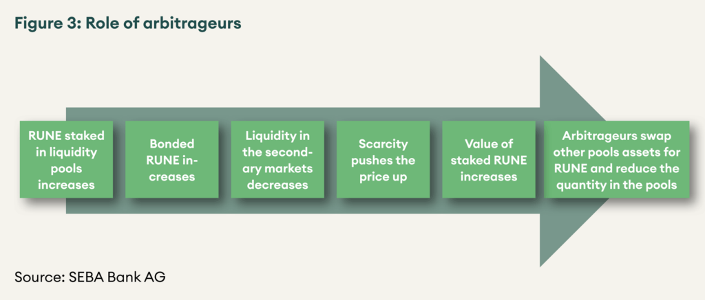 Given X*Y=K pools, the value of RUNE in pools is equal to the value of the other assets in the pool. Keep in mind that boded RUNE needs to be at least twice the staked RUNE in pools. As RUNE staked in pools increases, bonded RUNE also increases. As a result, RUNE in circulation decreases (see figure 3). The scarcity pushes the price in the secondary markets up. Assuming the value of non-RUNE assets in the pools remains the same, RUNE in pools is now worth more than other assets. Arbitrageurs spot this opportunity and provide other assets in the pool for RUNE. Thus, increasing the value of non-RUNE assets in the pools relative to RUNE and increasing RUNE supply in secondary markets. Similarly, arbitrageurs also play an essential role by providing other assets in exchange for RUNE when the value of RUNE relative to other assets drops. As arbitrage opportunities are short-lived, arbitrageurs end up paying a high fee to pools to execute their trades quickly.