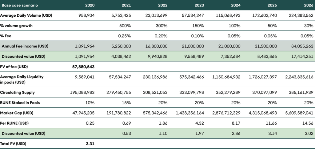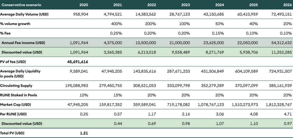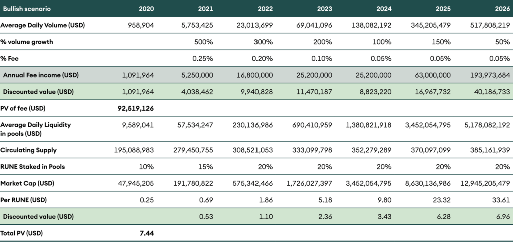Under this scenario, we assume that THORchain reaches Uniswap’s current volume within the next four years. We arrive at a fair value of RUNE around USD 7.63 in this scenario.