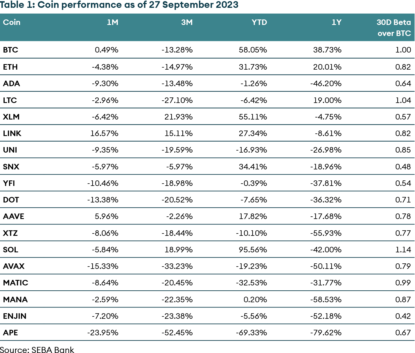 September has traditionally been a challenging month for the cryptocurrency market, but this time, it presented a departure from the norm. Contrary to historical patterns, the overall cryptocurrency market cap did not endure a “red” September, marking a significant shift. The total crypto market cap witnessed a marginal increase of just 0.5%. While Bitcoin exhibited resilience, outperforming most of the market, a few outliers such as Chainlink (up 16.6%) and Aave (up 6%) experienced notable gains. Conversely, Apecoin, Avalanche, and Polkadot faced substantial losses. During the month, Bitcoin’s dominance increased by 1.2%, hovering around USD 27.5K at the time of writing.