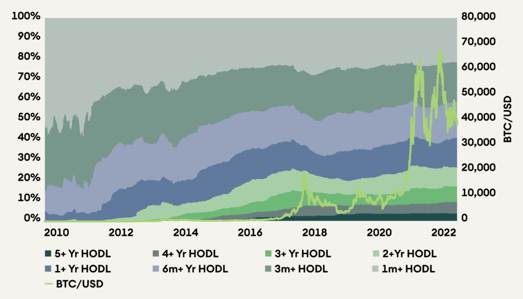 The HODL wave indicates the number of addresses holding their asset for more than a given time. As we have seen in the past, the same pattern repeats; new users get filtered during a correction after the bull run, and long-term holders start accumulating. Accounts holding for less than three months are reducing, and accounts holding for more than one year are increasing their holding.