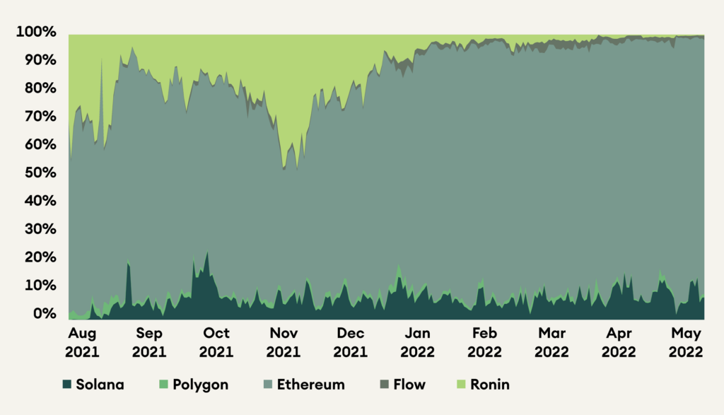 Further, during the rise of NFTs in 2021, alongside Ethereum, we saw many other smart contract platforms also adapting to NFTs and gaining market share. But as we continue to six-month-long duration since a new all-time high level, Ethereum has proved to be the most reliable platform for NFTs and is regaining market share, followed by Solana.