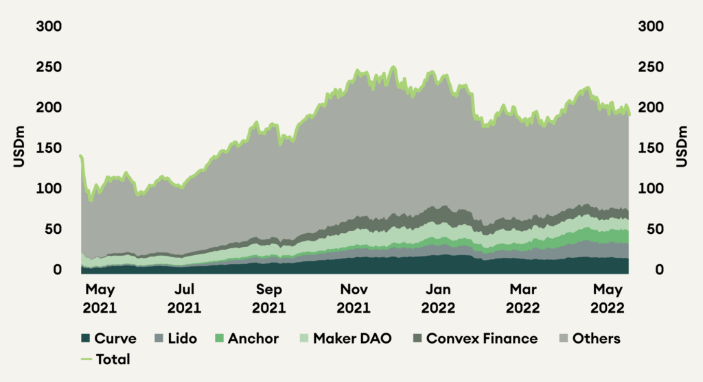 As we move towards the more application-specific assets, DeFi tokens, impact of macro parameters is significant, with UNI and AAVE prices dropping by 39% and YFI by 27%. As mentioned in the previous Digital Investors, the new user growth rate for the DeFi ecosystem is slowly declining. Keeping users on the platform is difficult as the only significant incentive is to generate a higher Annual Percentage Yield (APY). New projects usually offer higher APYs initially but fail to sustain them, resulting in most DeFi protocols taking the route of going multi-chain to retain/grow their user activity.