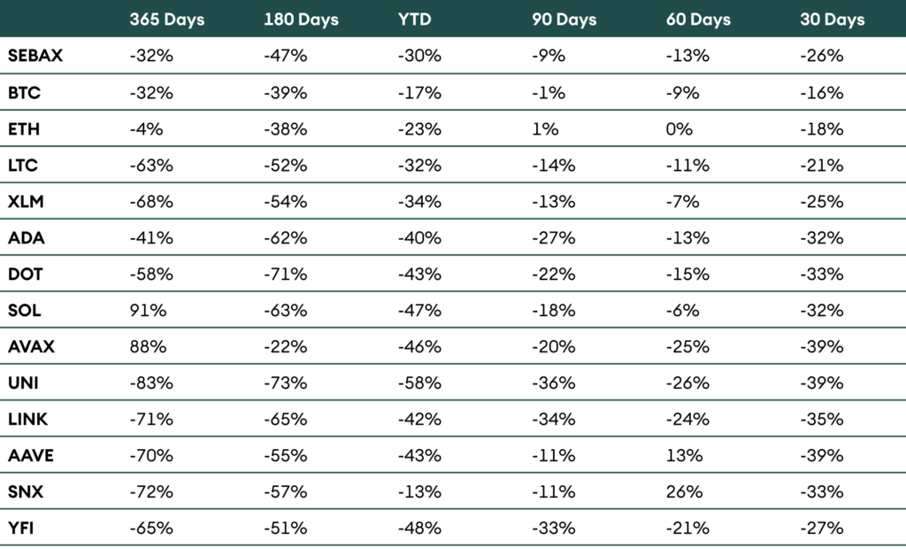 Table 1: Performance of AMINAX® and AMINA coin universe assets as of 01 May 2022