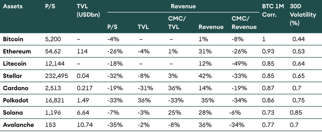 30-day volatility was low for most leading assets last month. While we see revenue growth in the table below, TVLs for key platforms are down except for Cardano and Polkadot. Indicating a low user growth rate in the DeFi ecosystem caused by a lack of innovation and the limitations of the technology.