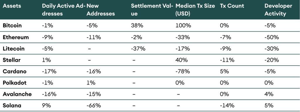 - Alternative platform blockchain assets among the AMINA offerings corrected more than BTC and ETH but showed a strong correlation, resulting in 30-day low volatility numbers. The decrease in NFT trading volume results in less on-chain activity for leading NFT blockchains (Ethereum, Solana, Flow), reducing active addresses and transaction count.