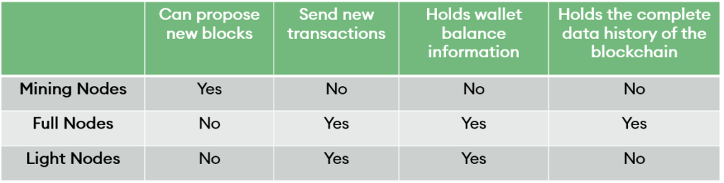 Generally, there are three distinct types of nodes – miner nodes, full nodes, and light nodes. Miner nodes can propose blocks and have the complete history of the blockchain. Full nodes have the complete history of the blockchain but cannot propose new blocks and light nodes rely on full nodes for blockchain’s history.