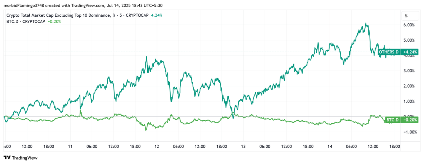 But in a twist, that’s impossible to ignore, Bitcoin’s historic rally is being outshined by altcoins. ETH has jumped nearly 20%, SOL is up 15%, XRP is soaring with a 35% gain, and SUI is up 30% in just seven days. Behind the scenes, institutions appear to be reshuffling — booking profits in BTC and pivoting toward higher-beta plays. BTC dominance has dipped 0.2% in the past week, quietly signaling this rotation.