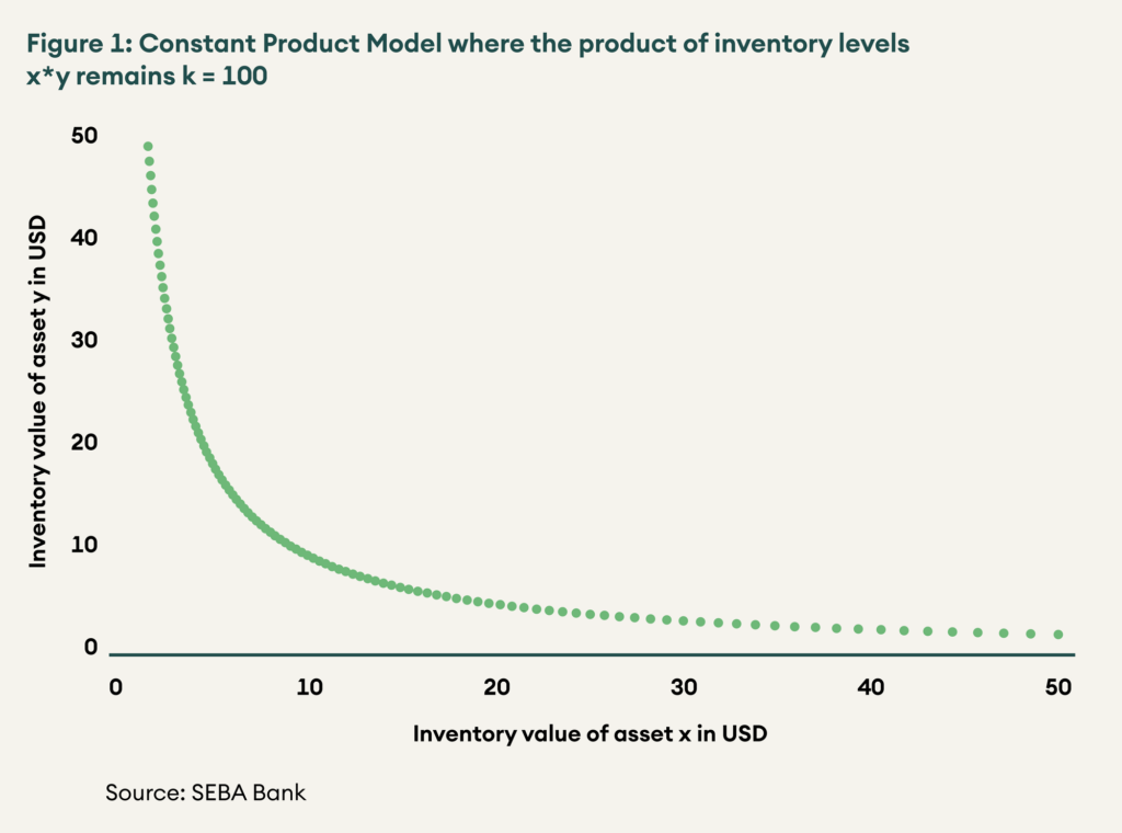 Figure 1: Constant Product Model where the product of inventory levels x*y remains k = 100