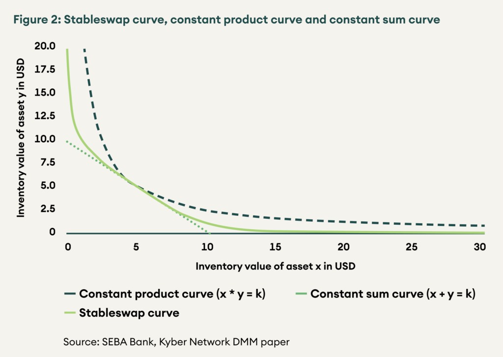 The constant product AMM has different relative prices at all inventory levels and, therefore, does not work well for highly correlated assets, like wrapped tokens, synthetic tokens, and stable coins. For this, Curve pioneered a modified constant sum model, which allows for a 1:1 exchange for most inventory levels. As illustrated in figure 2, the modified constant sum model is linear with the same slope for a large part of the curve allowing for a constant exchange rate, while the constant product model has a variable slope and a variable exchange rate at every point. Only at extreme inventory levels is the price is considered de-pegged from the other pool asset, and the price is allowed to change.