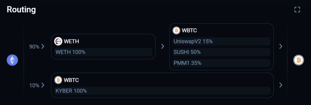 Picture 2: Routing provided by 1inch for a 100 ETH to WBTC transaction utilising Uniswap, Sushiswap, Kyber Network and a Private Market Maker