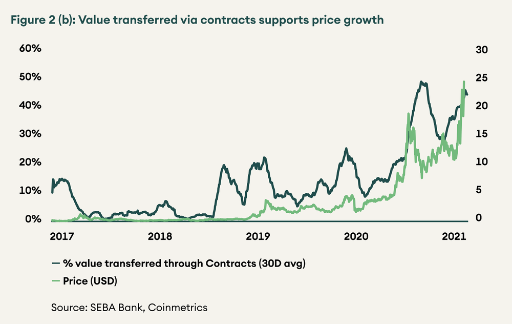 Another metric that suggests an increase in usage is the percentage of value transferred via contracts. Until mid-2020 this number barely touched 25%. After DeFi took off, we witnessed growth in the use of different contracts to settle value. The percentage of value transferred via contracts hovers around 45% now. Readers must note that value transferred through contract includes all the contracts (lending protocols, contracts that pay node operators, etc.)