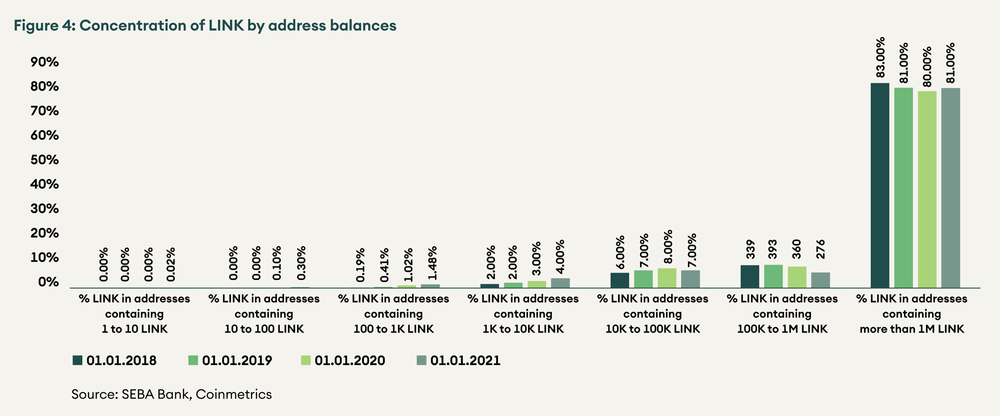 Figures 3 shows how LINK distribution has changed since 2018. The number of addresses containing between 1 to 10 LINK and 10 to 100 LINK saw significant growth in 2020-21. This growth in addresses is encouraging, as it suggests broad market participation.