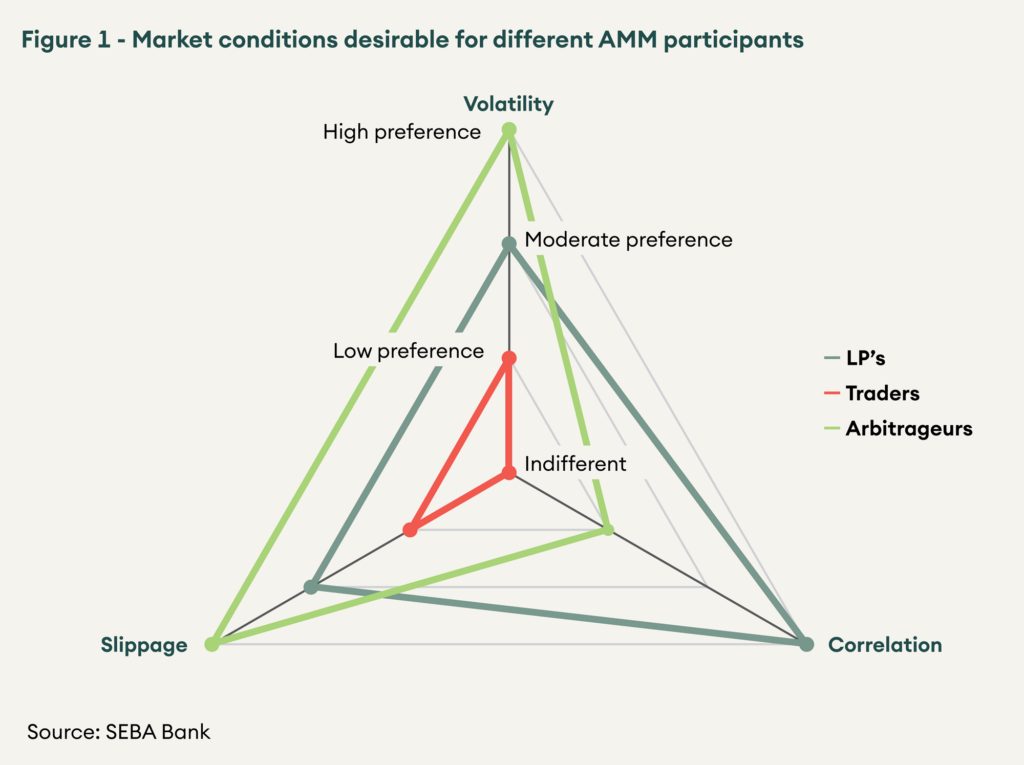 Figure 1 – Market conditions desirable for different AMM participants