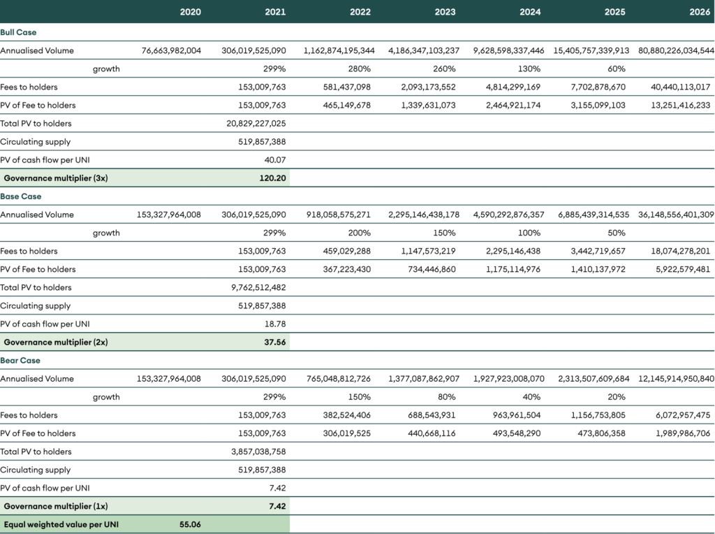 - For Uniswap, though the users don’t have any claims on cash flows, we have assumed a 0.05% fee going to UNI holders as we anticipate this to take place with the V3 launch