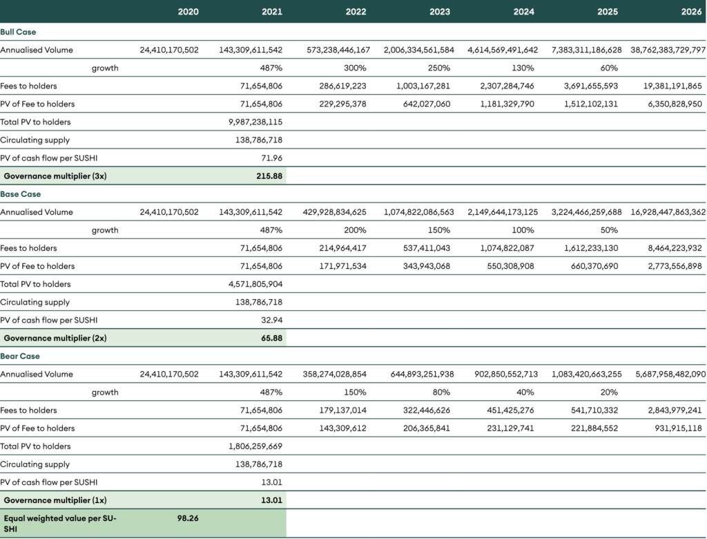 Many DeFi application tokens have cash flows linked to them. Therefore, they can be valued using discounted cash flows. We value UNI and SUSHI, the top two DEXes by market capitalisation, using the same methodology as valuing RUNE. For the rest, we carry out a relative valuation with a P/E ratio. The model takes three scenarios into account – bullish, base case, and bearish or conservative. In the bullish scenario, we gradually taper the current growth trajectory, and the bearish one assumes the growth receding quickly. The base case scenario takes a moderate stance between the other two.