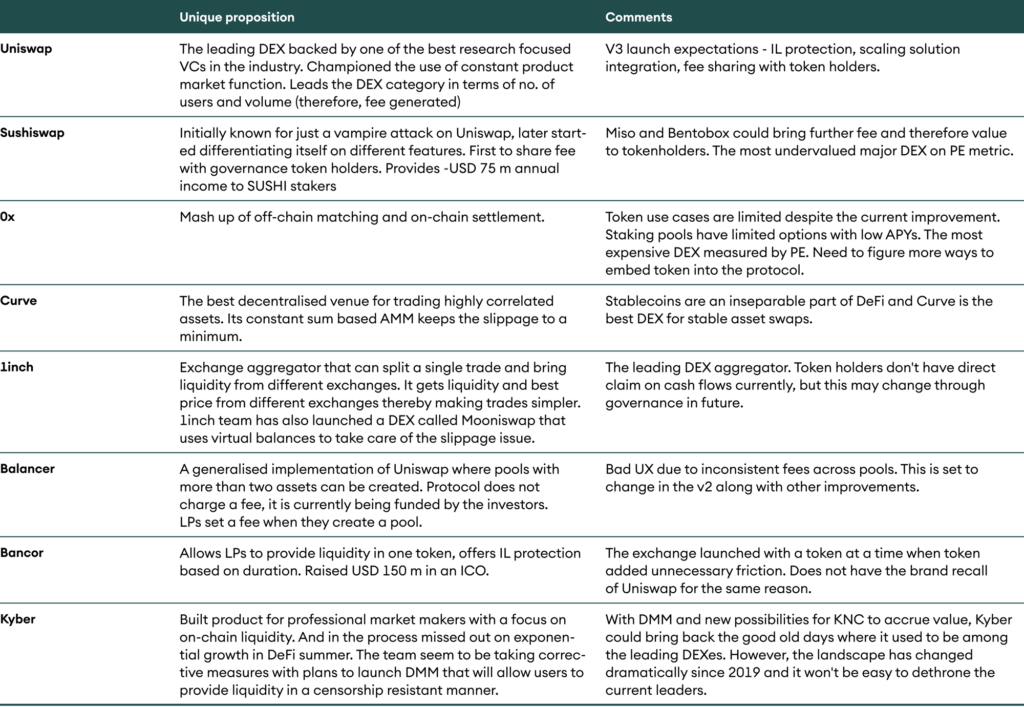 We touch upon different DEXes, their USPs, and their value accrual mechanism in this section.